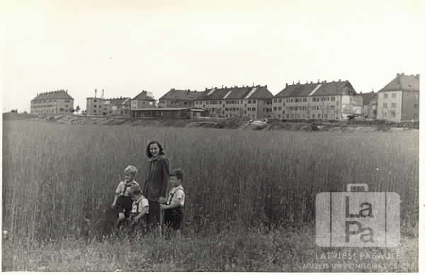Sieviete ar trīs maziem zēniem labības lauka malā pie Hohfeldes nometnes Augsburgā (amerikāņu zonā). Aiz plašā lauka uz nelielas nogāzes ir nometnes vairākstāvu dzīvojamās ēkas. No kreisās: Dainis Ohaks, Uldis Ohaks, Miervaldis Ohaks un Zenta ?.