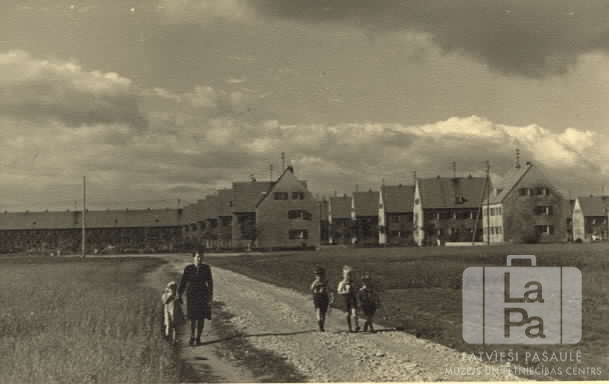 Sieviete ar četriem maziem bērniem staigā pa šauru zemes ceļu Haunštetenes nometnē Augsburgā (amerikāņu zonā) ap 1947. gadu. Abpus ceļam ir lauki. Fonā ir redzamas vairākas rindas ar nometnes divstāvu dzīvojamajām ēkām. No kreisās: Irena Reineks, Lidija Ohaks, Miervaldis Ohaks, Dainis Ohaks un Uldis Ohaks.