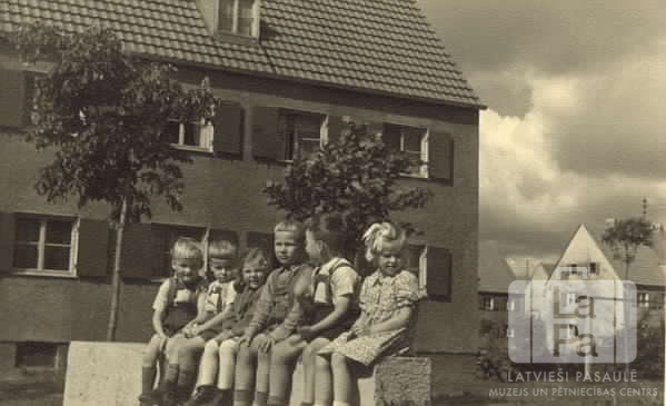Seši mazi bērni sēž rindā viens otram blakus uz zema mūra Haunštetenes nometnē Augsburgā (amerikāņu zonā) 1946. gada vasarā. Fonā ir divstāvu dzīvojamā ēka, tās priekšā aug divi mazi koki. Aiz ēkas labajā pusē ir redzamas citas divstāvu ēkas. No kreisās: pirmais Dainis Ohaks, otrais Uldis Ohaks, piektais Miervaldis Ohaks un sestā Irena Reineks.