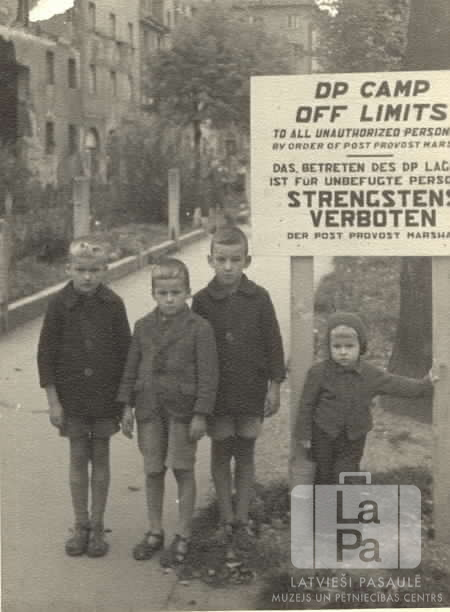 Četri mazi zēni stāv pie Hohfeldes nometnes robežzīmes Augsburgā (amerikāņu zonā) 1948. gada rudenī. Uz zīmes ir teksts angļu un vācu valodā: "DP CAMP / OFF LIMITS / TO ALL UNAUTHORISED PERSON... / ... / STRENGSTENS VERBOTEN". Fonā ir betonēta gājēju taka un vairākstāvu mūra ēka. Dainis Ohaks, Uldis Ohaks, Miervaldis Ohaks un Arnis Ohaks.