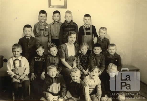 Pamatskolas pirmās klases skolēni ar skolotāju Hohfeldes nometnē Augsburgā (amerikāņu zonā). Bērni trīs rindās; otrās rindas vidū sēž skolotāja. Fonā ir gaiša iekštelpu siena ar mazu rāmi sienas vidū. Otrajā rindā, pirmais no kreisās: Dainis Ohaks. Pēdējā rindā kreisajā pusē ir redzams Miervaldis Ohaks.