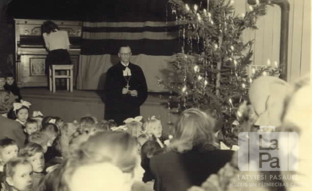 Bērnu eglīšu vakars Ziemassvētkos Hohfeldes nometnē Augsburgā (amerikāņu zonā). Priekšplānā ir pieaugušie un liela bērnu grupa. Aiz bērniem stāv mācītājs amata tērpā blakus izdekorētai svētku eglei. Aiz mācītāja uz skatuves sieviete sēž pie klavierēm.