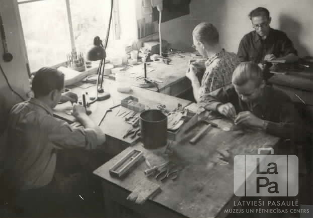 Četri sudraba un zelta rotkaļi strādā pie galdiem savā darbnīcā Hohfeldes nometnē Augsburgā (amerikāņu zonā). Uz galdiem ir darbarīki un dažādi priekšmeti. Kreisajā pusē ir logs.