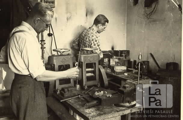Divi zeltkaļi pie darbgaldiem savā darbnīcā