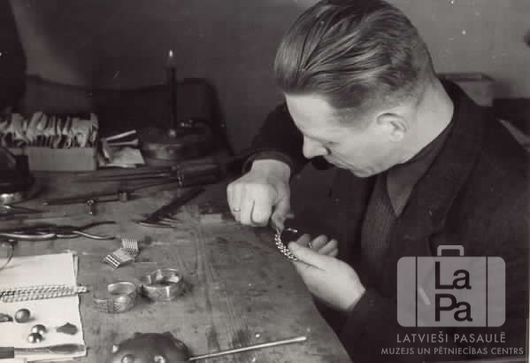 Sudrabkalis pie galda taisa Nameja aproci Hohfeldes nometnē Augsburgā (amerikāņu zonā). Uz galda ir darbarīki un rotaslietas. Sudrabu rotaslietu izgatavošanai ieguva no 5 latu gabaliem, ko latvieši bija veduši līdzi trimdā.