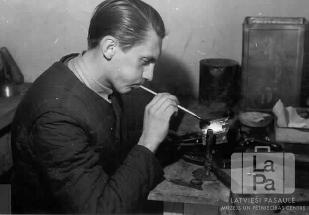 Sudrabkalis strādā darbnīcā Hohfeldes nometnē Augsburgā (amerikāņu zonā). Vīrietis pie darbgalda, iespējams, pūš ar mazu, tievu cauruli ugunī. Aizmugurē uz galda ir kaste, bundža un citi priekšmeti.