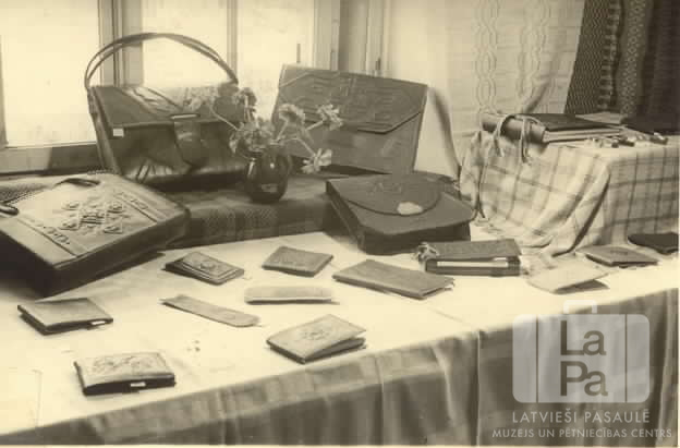 Ādas izstrādājumi ādas darbu izstādē Hohfeldes nometnē Augsburgā (amerikāņu zonā). Uz galda un uz loga palodzes ir dažādi maki un portfeļi. Palodzes vidū ir arī maza vāze ar ziediem.
