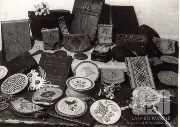 Ādas izstrādājumi ādas darbu izstādē Hohfeldes nometnē Augsburgā (amerikāņu zonā). Uz galda ir dažādi ādas priekšmeti, tostarp maki, portfeļi un mazas kastes.