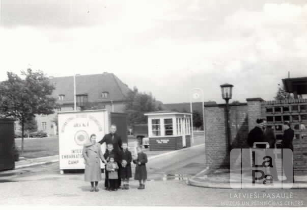 Ohaku ģimene stāv pie ieejas vārtiem Gronas nometnē pie Brēmerhāfenes (angļu zonā). Iebrauktuve ir sadalīta divās brauktuves daļās, ar nometnes zīmi un sargu būdu pa vidu starp brauktuvēm. Māte, tēvs un četri mazi zēni stāv vienas brauktuves atvērtu vārtu priekšā. Labajā pusē pie ķieģeļu sienas stāv trīs vīrieši. Aiz iebrauktuves ir divstāvu mūra ēka. Nometnes ieejas priekšā stāv – priekšā Arnis Ohaks; otrajā rindā stāv, no kreisās: Lidija Ohaks, Dainis Ohaks, Miervaldis Ohaks un Uldis Ohaks; aizmugurē stāv Didriķis Ohaks.