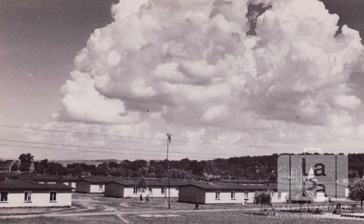 Laukums un vienstāvu barakas Junkersa nometnē Kaselē (amerikāņu zonā) 1948. gada vasarā. Laukuma vidū ir masts ar plīvojošu karogu galā. Pa laukumu pastaigājas vairāki cilvēki. Labajā apakšējā stūrī ir redzams nometnes peldbaseins. Fonā ir mežs. Foto autors: Uldis Roze.
