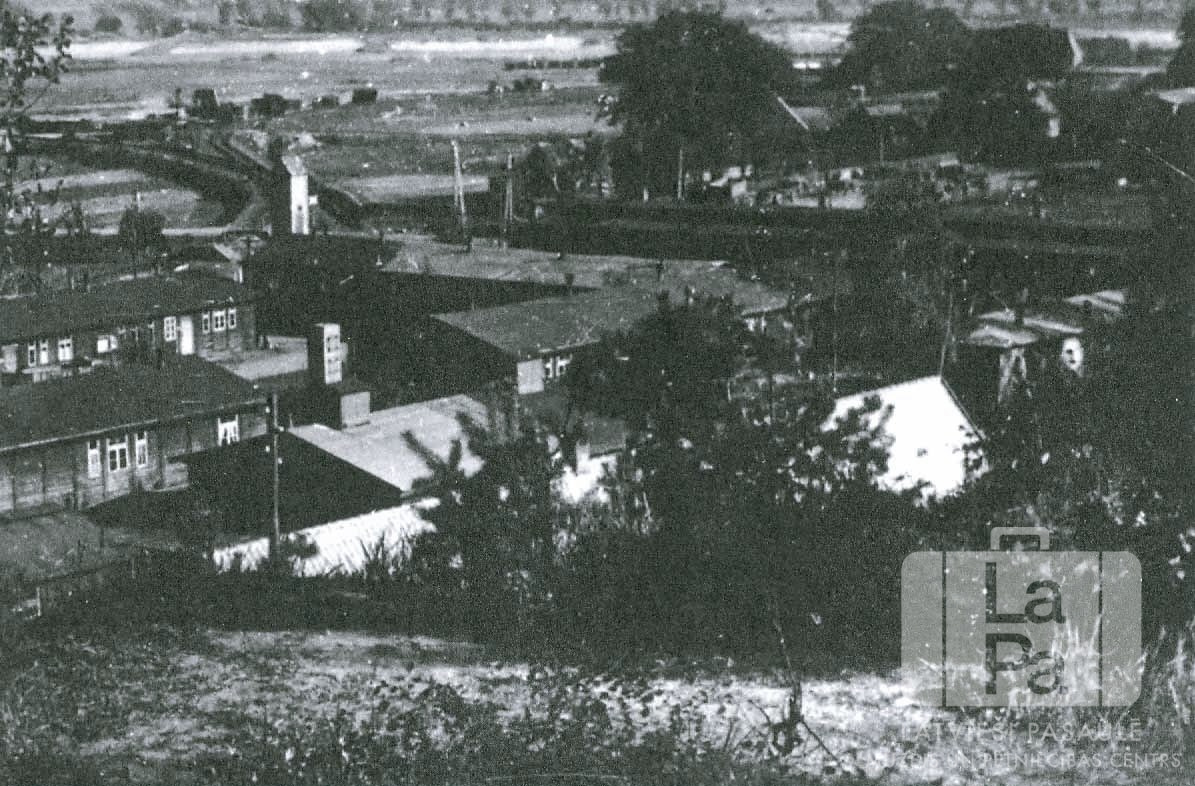 Vienstāvu koka barakas Altgarges nometnē (angļu zonā). Skats no uzkalna. Iespējams, fonā aiz barakām ir redzama Elbas upe ar Padomju Savienību upes otrā krastā.