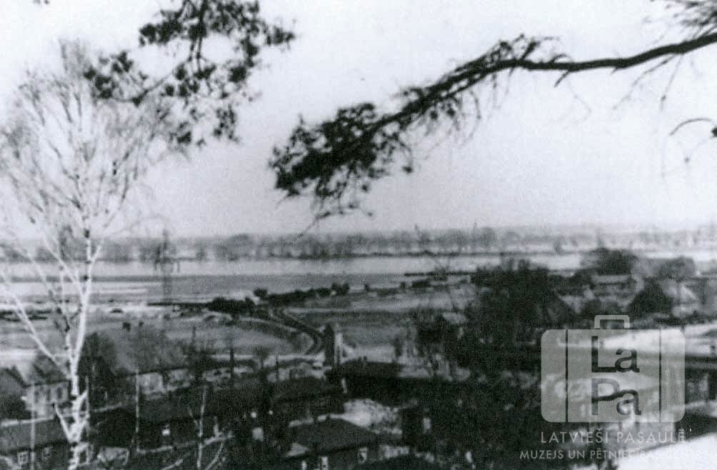 Vienstāvu koka barakas Altgarges nometnē (angļu zonā). Aiz barakām ir redzamas dzelzceļa sliedes un Elbas upe. Skats no augšas cauri vairākām koku galotnēm.