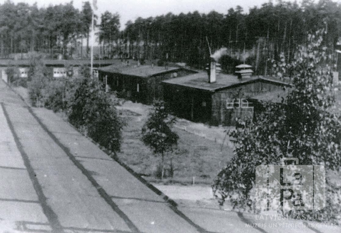 Vienstāvu koka barakas Altgarges nometnē (angļu zonā). Redzama ir daļa no nometnes teritorijas. Barakām pa vidu ir pagalms ar iestādītiem kokiem, zālienu un karogmastu. Skats no augšas – no barakas jumta. Fonā ir priežu mežs.