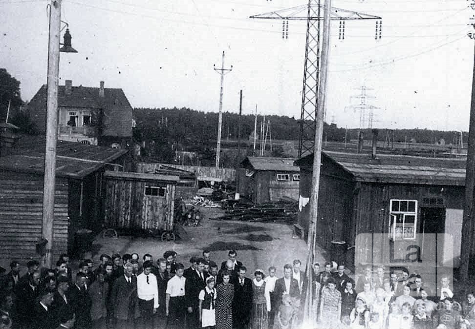 Ļaudis stāv vienstāvu koka baraku priekšā Altgarges nometnes (angļu zonā) lietuviešu daļā. Cilvēki stāv vairākās rindās priekšplānā. Fonā aiz barakām ir divstāvu mūra ēka, lauki, elektrības līniija un meži. Divstāvu māja aizmugurē ir angļu komandanta, pulkvežleitnanta ? Pigota mītne.