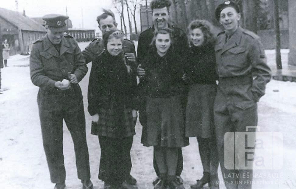 Četri angļu karavīri stāv uz ielas ar trīs latviešu jaunietēm Altgargē (angļu zonā). Fonā kreisajā pusē pie vienas no ēkām ielas malā stāv sieviete gaišā tērpā. Labajā pusē ielas malā ir koku rinda. Priekšā, no kreisās: otrā Vija Rogaine, trešā Biruta Pekse, ceturtā Biruta Purcena.