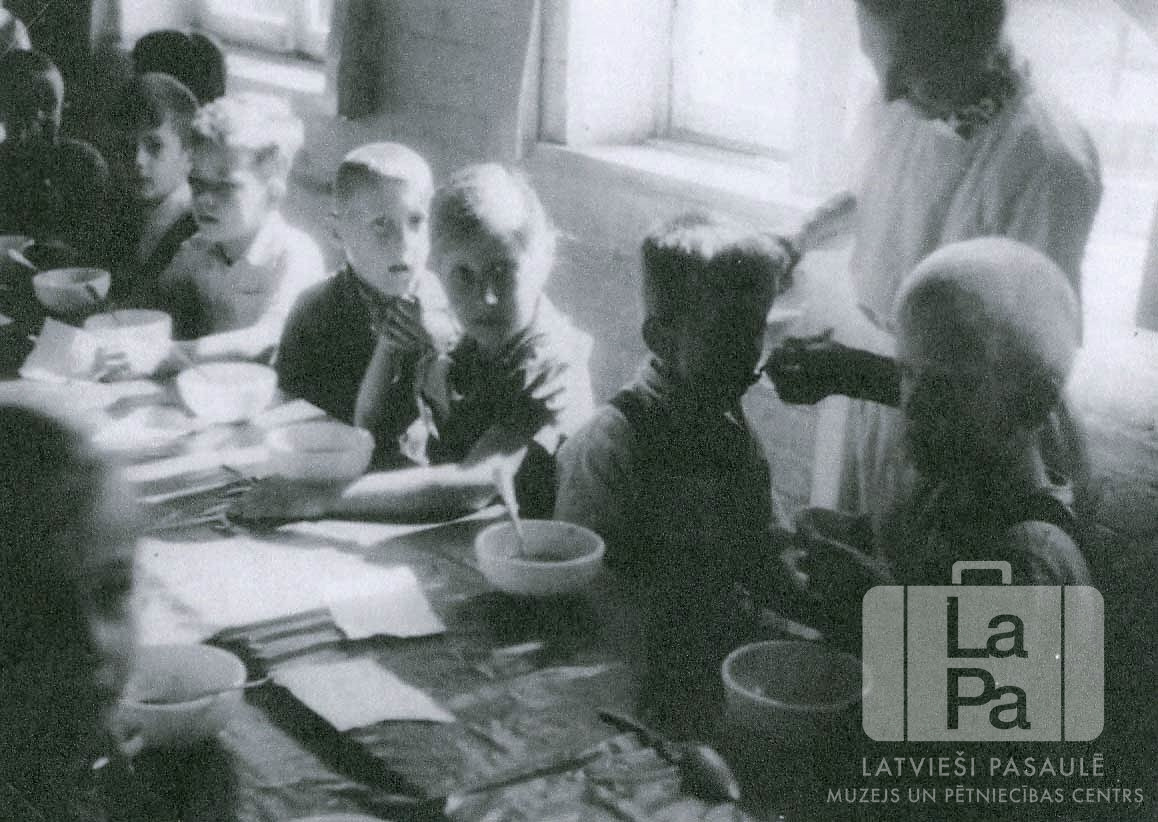 Bērni ēdienreizes laikā sēž pie galda Altgarges nometnē (angļu zonā). Uz galda ir ēdienu trauki. Sieviete gaišā tērpā baro vienu zēnu ar karoti. Fonā ir telpas logi.