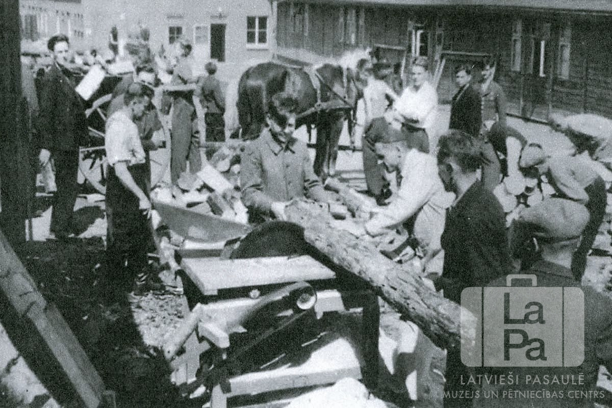 Malkas sagatavošana Altgarges nometnē (angļu zonā). Priekšplānā vīri zāģē baļķi uz malkas zāģa. Aizmugurē vīri krāmē sazāģēto malku zirga vilktos ratos. Iespējams, malkas gatavošana bija daļa no galdnieka darbnīcas mācekļu darbiem. Fonā ir nometnes ēkas. Par šo gadījumu Uldis Siliņš stāsta: "Galdnieku darbnīcā strādājām un mācījāmies jaunus amatus, kuŗus varētu izmantot nākotnē jaunās mītnes zemēs."