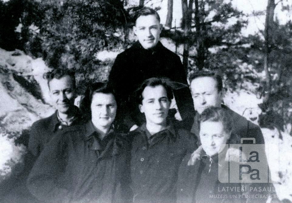 Spiestuves darbinieki ziemas laikā Altgarges nometnē (angļu zonā). Nometnes spiestuve izdeva avīzi un arī pavairoja korim notis. Fonā ir apsnigusi meža nogāze. Otrajā rindā, no kreisās: pirmā R. Meistare, trešais N. Veinbergs. Trešajā rindā, otrais no kreisās: A. Gerhards.