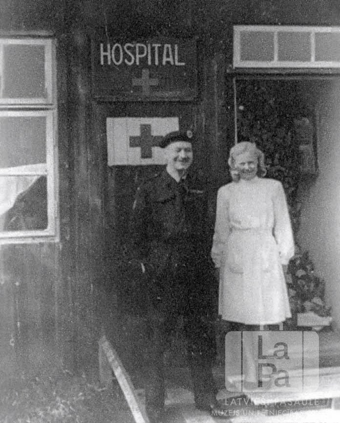 Altgarges nometnes (angļu zonā) angļu komandants un slimnīcas vadītāja stāv pie slimnīcas. Vīrietis ir ģērbies formastērpā, sieviete ir ģērbusies gaišā apģērbā. Fonā pie sienas ir divi krusti un uzraksts "HOSPITAL". Labajā pusē atvērtās ēkas durvīs ir redzama sakrāmēta malka. No kreisās: ? Pigots (pulkvežleitnants) un L. Vītola.