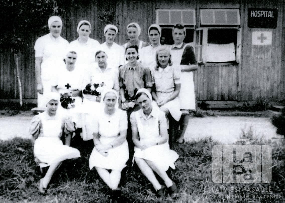 Altgarges nometnes (angļu zonā) slimnīcas personāls gaišos halātos. Vairākām sievietēm rokās ir ziedi. Fonā ir nometnes slimnīca. Labajā pusē uz koka ēkas sienas ir zīme "HOSPITAL" un viens krusts, kā arī divi atvērti logi. Pirmajā rindā, trešā no kreisās: R. Paegle. Otrajā rindā, no kreisās: Veronika Krima (Sarkanā Krusta māsa), ? Finka (Rīgas slimnīcās vecmāte), nezināms (904. apgabala UNRRAs māsa) un L. Vītola (slimnīcas vadītāja). Trešajā rindā, otrā no kreisās: L. Stražinska. Grupā vēl ir redzamas: E. Akmene, H. Akmendiene, M. Fridenberga, J. Leilande, A. Vinklera, J. Grikis, G. Taraseva. Par šo gadījumu Uldis Siliņš stāsta: "Labi, ka nometnē bija sava slimnīciņa, jo pārtikas trūkuma un slikto un saspiesto nometnes apstākļu dēļ bērni bieži tur nonāca. Daži saslima arī ar difteriju."