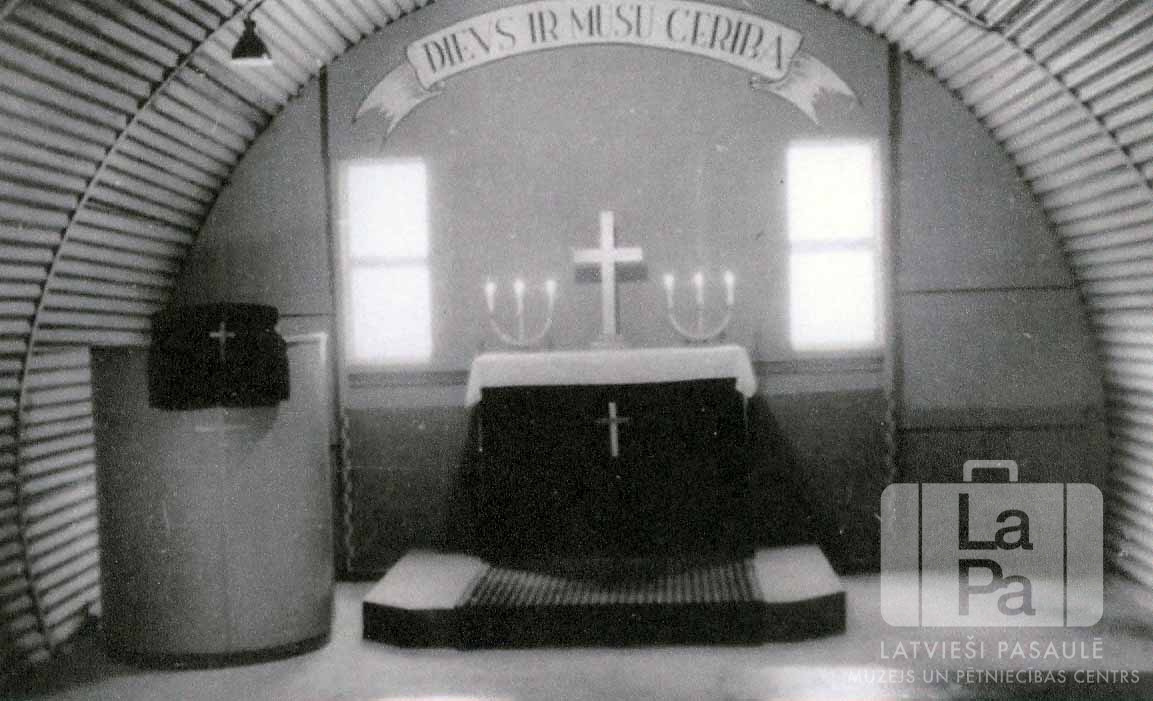 Baznīcas altāris Altgarges nometnē (angļu zonā). Uz altāra ir divi svečturi ar sešām aizdegtām svecēm un krusts. Uz sienas virs altāra ir uzraksts "Dievs ir mūsu cerība". Kreisajā altāra pusē ir mācītāja kancele. Baznīca ir zema un kupolveida.
