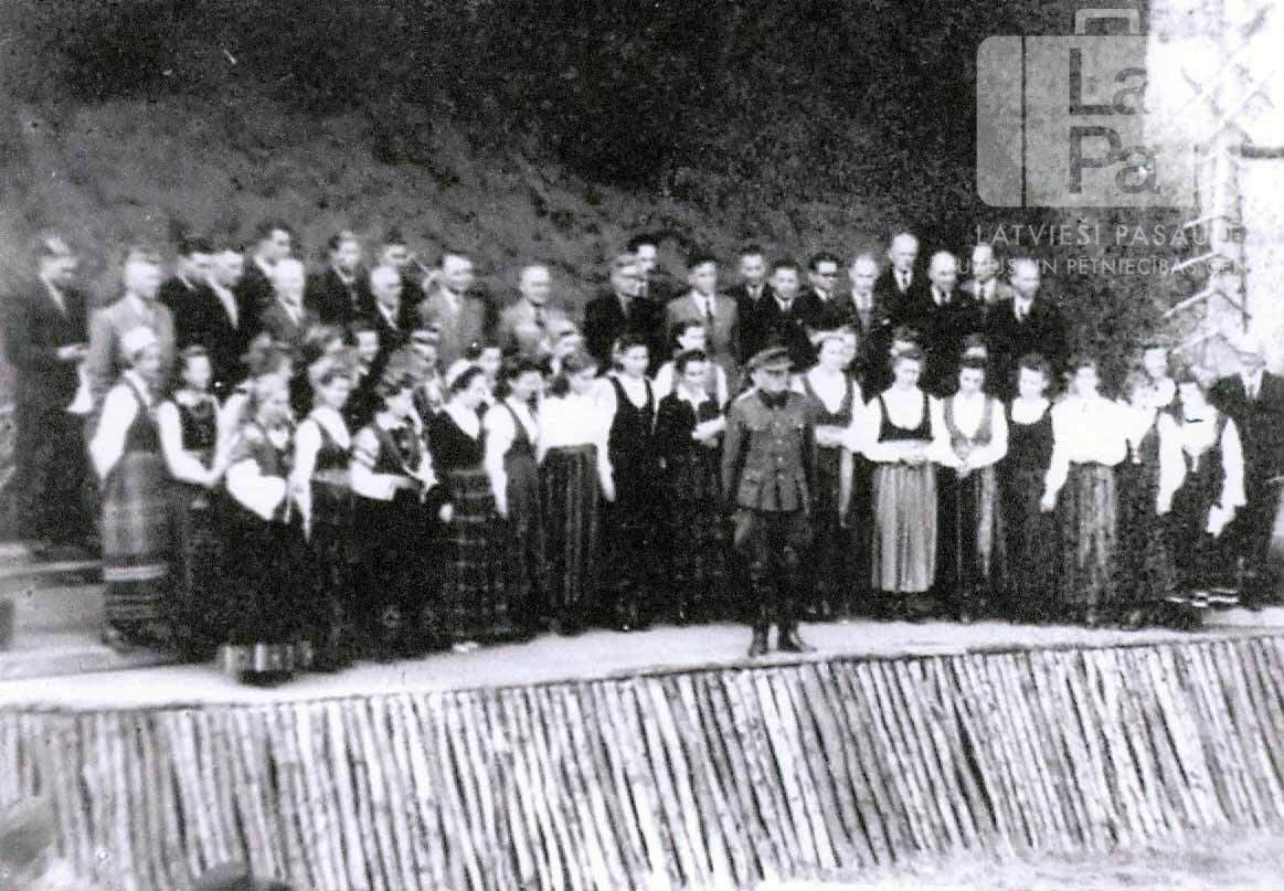 Latviešu koris no Altgarges nometnes (angļu zonā) stāv uz skatuves Putlosas gūstekņu nometnē ciemošanās laikā pie latviešu karavīriem. Koristi stāv vairākās rindās. Priekšā stāv sievietes tautastērpos, aizmugurē stāv vīri uzvalkos. Koristu priekšā stāv un karavīrus uzrunā A. Kripēns (pulkvedis).