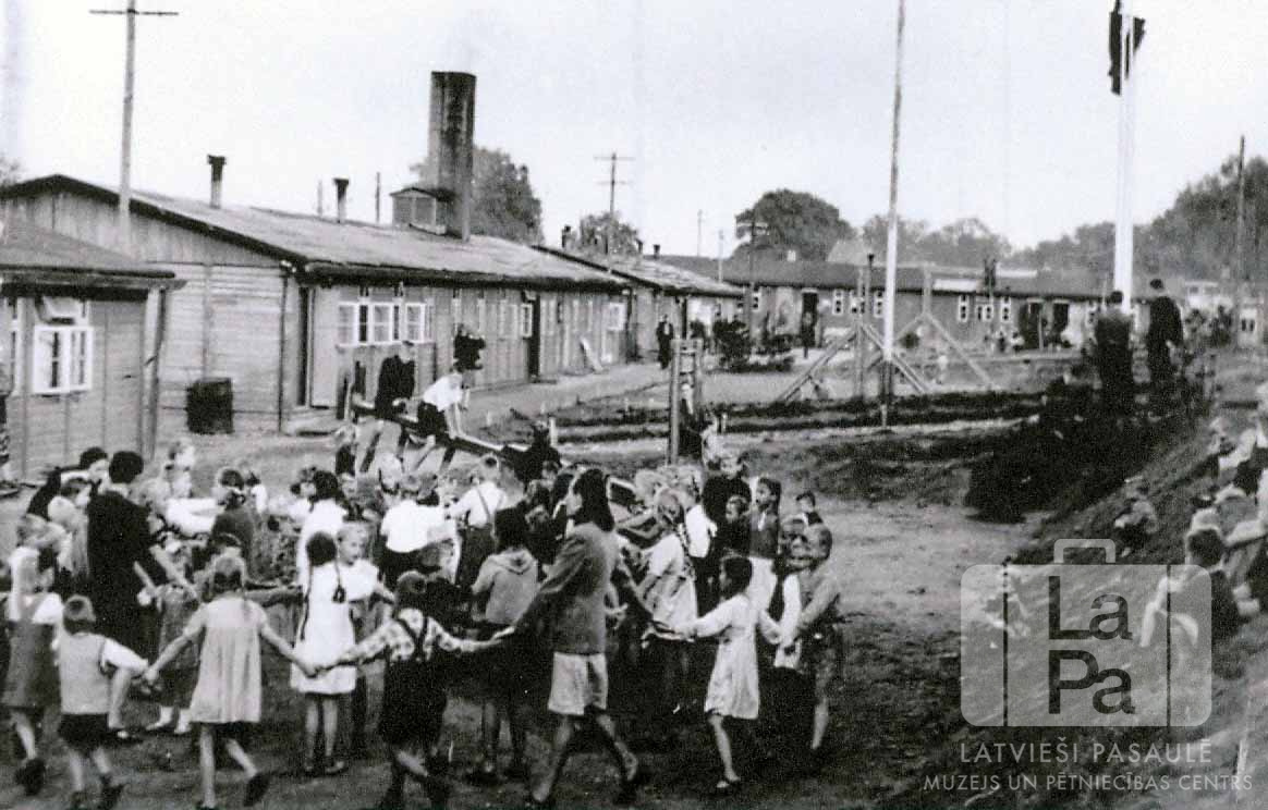 Bērni spēlē apļu rotaļas Altgarges nometnes (angļu zonā) Bērnu svētkos. Labajā pusē uz nogāzes sēž daži mazi bērni. Fonā ir vienstāvu koka barakas, gar kurām pastaigājas cilvēki, kā arī masts ar plīvojošiem karogiem.