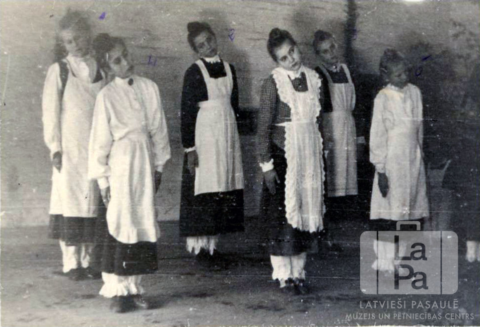Sešas meitenes I. Zalanes Bērnu svētku uzvedumā "Vecmodīgas vingrotājas" Altgarges nometnē (angļu zonā) 1945. gada Vasarsvētkos. Meitenes ir ģērbušās gaišos priekšautos, ar uz sānu noliektām galvām. Priekšā, no kreisās: Karina Valtere, Elga Gustiņa un Vija Rogaine. Aizmugurē, no kreisās: Aina Ziediņa, Skaidrīte Sudraba un Ilga Cilite.