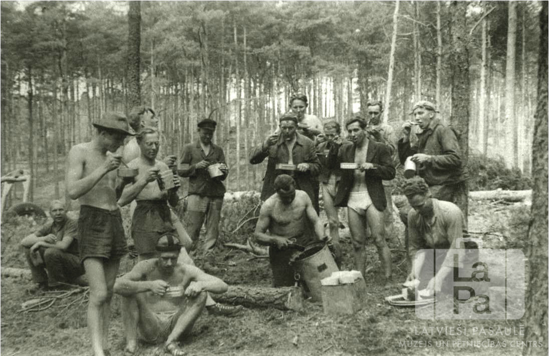 Mežstrādnieku grupa no Altgarges nometnes (angļu zonā) karstā 1946. gada vasaras dienā mežā ēd launagu. Vīrieši ēd no metāla traukiem.