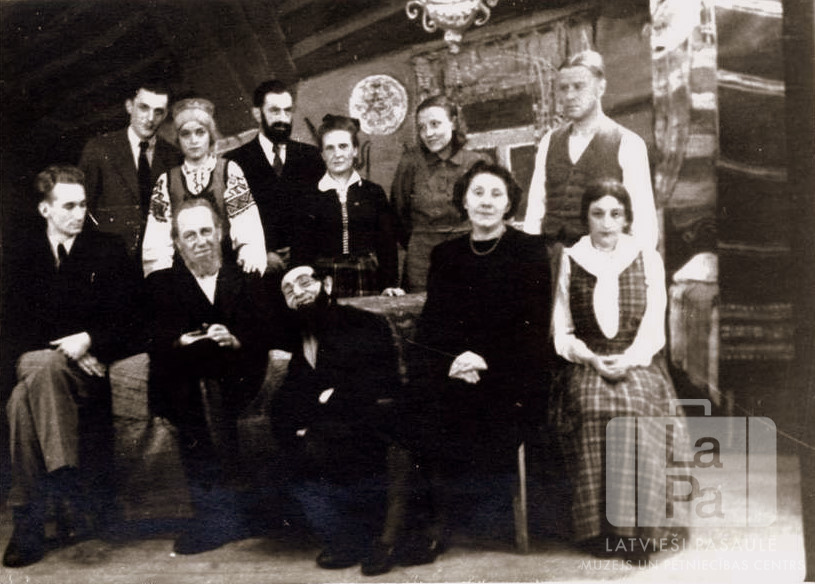 Aktieri tērpos un grimā Rūdolfa Blaumaņa lugā "Zagļi" Altgarges nometnē (angļu zonā). Izrādi uzveda nometnes teātra grupa. Fonā ir uzgleznots koka ēkas iekštelpu skats. Pirmajā rindā, no kreisās: J. Soikans, M. Siliņš, V. Plukšs, M. Valtere, E. Pauliņa. Aizmugurē, no kreisās: pirmais E. Paegle, otrā V. Zariņa un astotais A. Krūmiņš. Par šo gadījumu Uldis Siliņš stāsta: "'Zagļi' ir joku luga ar dziedāšanu divos cēlienos, kuŗa bija Blaumaņa pirmā sarakstītā luga."