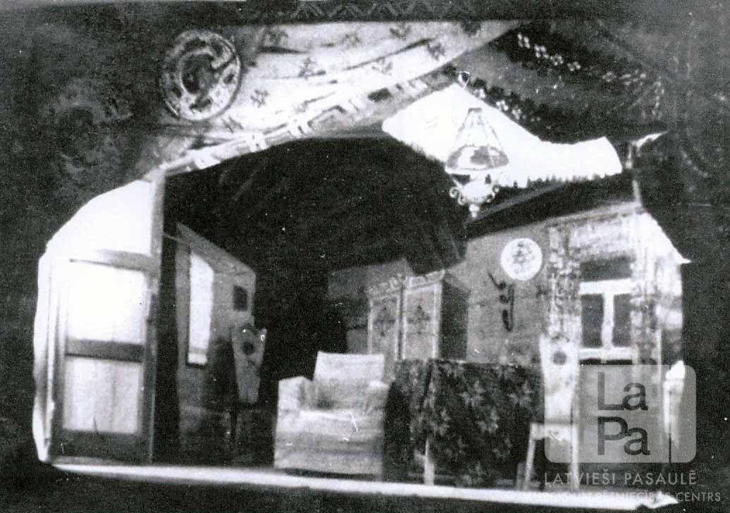 Skatuves dekorācijas Rūdolfa Blaumaņa lugai "Zagļi" Altgarges nometnē (angļu zonā). Skatuves vidū ir klubkrēsls, galds un skapis. Vēl uz skatuves ir redzami divi koka krēsli, logs ar aizkariem, lampa un citi priekšmeti. Priekšplānā ir redzams rakstains skatuves aizkars. Par šo gadījumu Uldis Siliņš stāsta: "Dekorācijas bija vienmēr tik rūpīgi sagatavotas, kā vislabākos teātros."