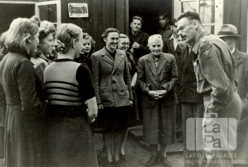 Altgarges nometnes (angļu zonā) angļu administrators majors ? Grenvels ciemojas pie ģimnāzistiem. Vīrietis formastērpā stāv labajā pusē. Kreisajā pusē stāv ģimnāzistes. Fonā ir koka baraka ar atvērtu logu un ieejas durvīm, starp kuriem uz ēkas sienas ir zīme "Ģimnazija". Pie ēkas ieejas stāv vecāka sieviete un jaunekļi. Pirmais no labās: R. Rutks (ar cepuri galvā; inženieris, Nacionālās komitejas priekšsēdētājs). Pie ēkas ieejas stāv trīs jaunekļi, no kreisās: I. Milics, Uldis Siliņš, A. Nadziņš. Grupā vēl ir redzami, ar seju pret fotogrāfu: L Šmite, E. Babane, V. Šermule, M. Rupeka, J. Gargurnis, J. Soikans (?). Grupā ir redzami, ar mugurām pret fotogrāfu: I Gerharde, V. Damme, A. Celle.
