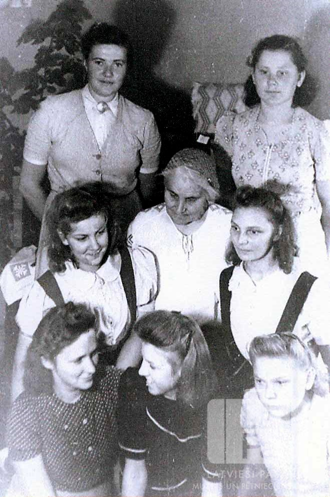 Astoņas rokdarbu klases dalībnieces trīs rindās Altgarges nometnē (angļu zonā). Iespējams, otrās rindas vidū ir klases vadītāja. Skats no augšas. Pirmajā rindā, no kreisās: V. Damme, I. Gerharde un Dz. Sudraba. Otrajā rindā, no kreisās: L. Šmite, M. Rupeka, E. Skrastiņa. Trešajā rindā, no kreisās: Vilma Strazdiņa un Vija Einberga.