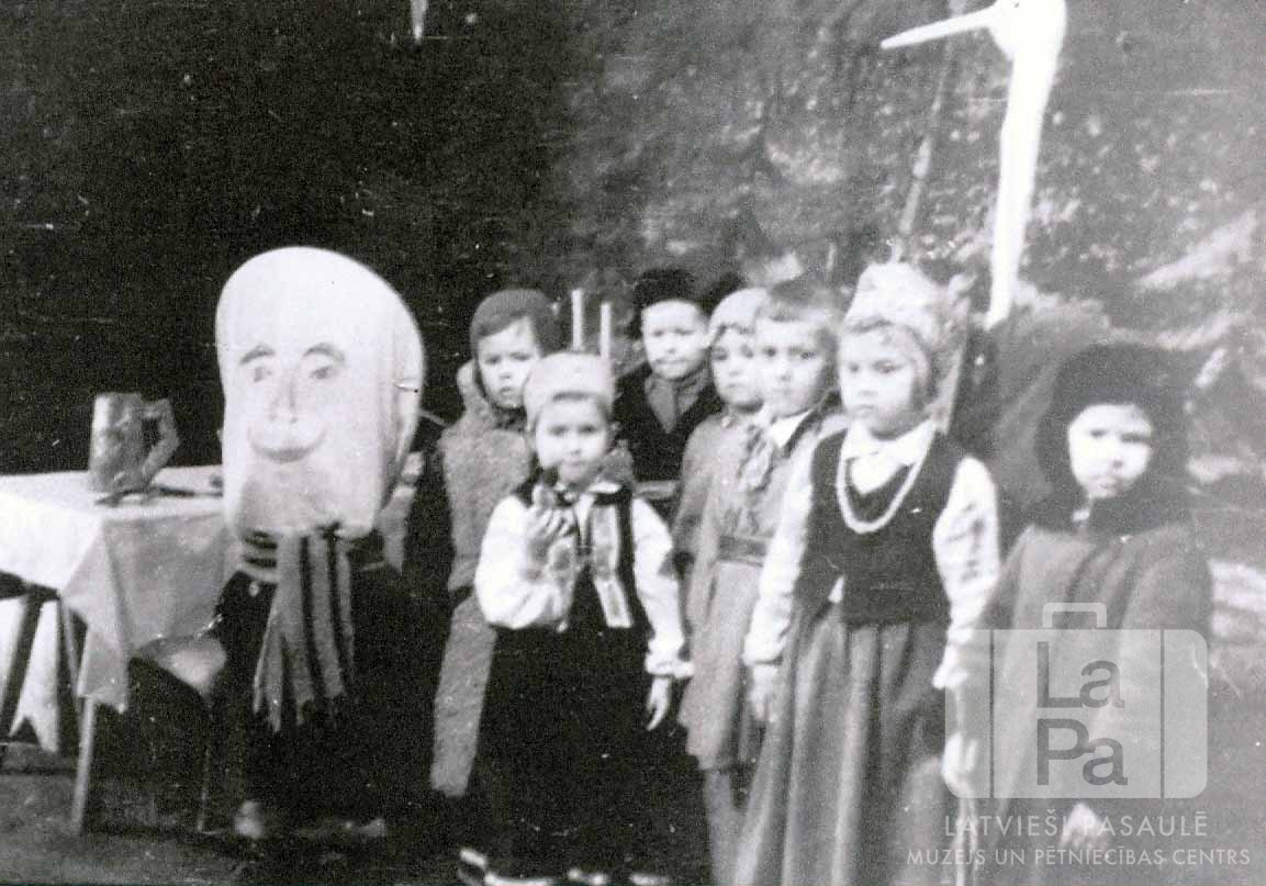 Pamatskolas skolēnu Ziemassvētku uzvedums "Ziemassvētku nakts" Altgarges nometnē (angļu zonā). Iespējams, to uzveda I. Zalāne. Mazi bērni stāv uz skatuves tautastērpos, ziemas mēteļos un šallēs, kā arī citos tērpos. Kreisajā pusē ir dekorācija – liela, uzzīmēta seja. Aiz tās ir ar gaišu galdautu pārklāts galds, uz kura ir liela krūze.