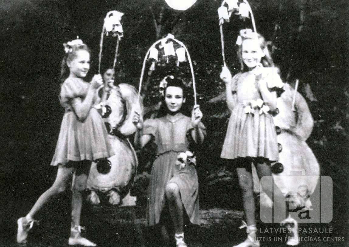 Pamatskolas skolēnu Ziemassvētku uzvedums "Ziemassvētku nakts” Altgarges nometnē (angļu zonā). Iespējams, to uzveda I. Zalāne. Mazas meitenes gaišās kleitās uz skatuves. Pirmajā rindā viena meitene ir notupusies uz ceļa, pārējās meitenes stāv kājās. Trīs meitenes priekšā rokās tur pusapaļus statīvus ar maziem zvaniem (?). Aizmugurē stāv divi bērni aiz zīmētām dekorācijām – gaišiem sniegavīriem ar tumšām pogām. Fonā ir zīmēta skatuves dekorācija ar apsnigušu egļu mežu.