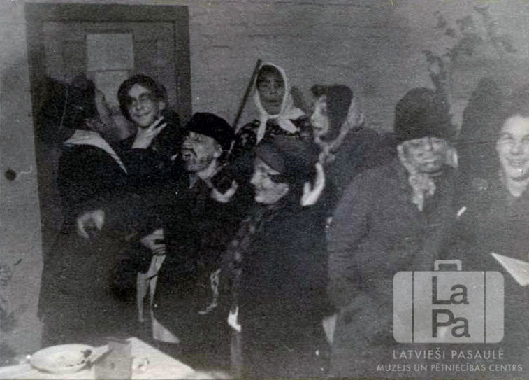Jaunieši tērpos un grimā iekštelpās atzīmē Mārtiņdienu Altgarges nometnē (angļu zonā). Visi ir tērpušies tumšās drēbēs, ar netīrām sejām. Priekšplānā kreisajā pusē ir redzams galda stūris ar traukiem. Fonā ir durvis. Pirmajā rindā, no kreisās: pirmā E. Babane, ??, ??, ceturtais N. Soikans un piektais I. Milics. Otrajā rindā, no kreisās: A. Nadziņš, Uldis Siliņš un N. Ziglevica.