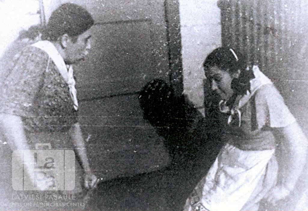 Divas aktrises Annas Brigaderes lugā "Raudupiete” Mārtiņdienas vakarā Altgarges nometnes ģimnāzijā (angļu zonā). Viena sieviete rāj otru. Fonā ir durvis. No kreisās: E. Siliņa (skolotāja) un I. Āboltiņa (skolotāja).