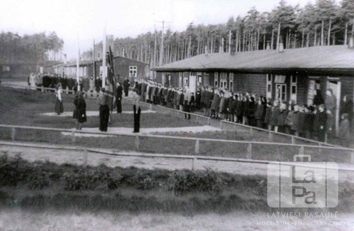 Svinīgā karogu pacelšana no rīta Altgarges nometnes (angļu zonā) laukuma pirmajās Latvijas Valsts svētku svinībās. Kreisajā pusē ar zemu žogu iežogotā zonā jaunieši stāv pie karogmastiem, kuros tiek pacelti karogi. Labajā pusē un aizmugurē vienstāvu koka baraku priekšā stāv cilvēku rindas. Priekšplānā ir gājēju taka. Fonā ir priežu mežs. Pie karoga masta ir redzams Uldis Siliņš (komandē karoga pacelšanu) un divas asistentes māsas Vasermanes.