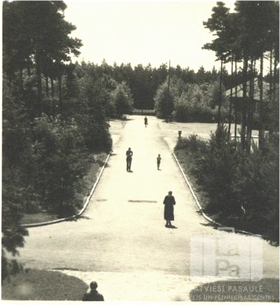 Cilvēki pastaigājas pa ceļu Dedelstorfas nometnē (angļu zonā). Priekšplānā ceļš sazarojas. Abās ceļa pusēs un ceļa galā ir mežs. Labajā pusē caur kokiem ir redzams vienstāvu ēka. Skats no augšas.