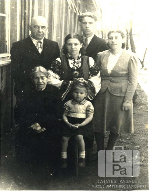 Siliņu ģimene Ulda Siliņa iesvētību dienā Dedelstorfas nometnē (angļu zonā) 1948. gada pavasarī. Veca sieviete un maza meitene sēž priekšā, pārējā ģimene stāv aizmugurē. Kreisajā pusē ir vienstāvu koka "O" baraka. Priekšā sēž, no kreisās: Anna Paegle un Maruta Deķe. Otrajā rindā stāv, no kreisās: Martiņš Siliņš, Elza Siliņa un Milda Deķe. Trešajā rindā stāv Uldis Siliņš.