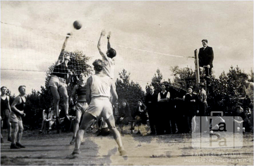 Divas volejbola komandas cīnās par bumbu virs tīkla Dedelstorfas nometnē (angļu zonā) 1948. gada vasarā. Tīkla galā uz paaugstinājuma stāv tiesnesis. Fonā ir redzami skatītāji meža malā. Komandas ir ģērbušās tumšos un gaišos kreklos. Volejbola komanda tumšos kreklos, no kreisās: otrais E. Auzelis un ceturtais Uldis Siliņš. Par šo gadījumu Uldis Siliņš stāsta: "Altgarges, un vēlāk Dēdelstorfas nometne, bija viena no "volejbola cietokšņiem". Tā man bieži iznāca reprezentēt savu nometni draudzības spēlēs.”