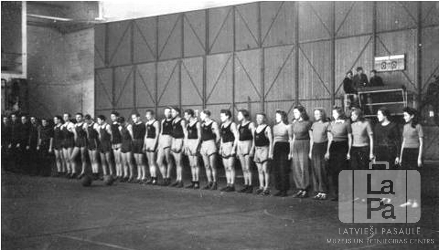 Sieviešu un vīriešu basketbolistu komandas sporta tērpos stāv rindā viens otram blakus pirms basketbola turnīra spēles Dedelstorfas nometnē (angļu zonā). Šajā nometnē basketbola turnīri notika bijušajos lidmašīnu angāros. Sportistu priekšā uz zemes ir divas bumbas. Fonā ir redzamas augstas angāra durvis un trīs vīrieši uz paaugstinājuma pie, iespējams, rezultātu tablo.