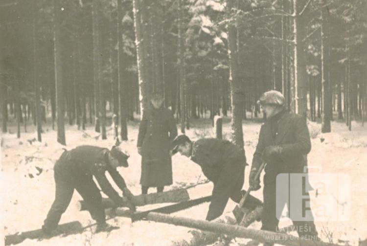 Vīri no Zēdorfas nometnes (angļu zonā) strādā mežā malkas talkas laikā. Divi vīrieši ar divroci-zāģi zāģē baļki. Viņiem blakus stāv divi vīrieši, viens no viņiem tur rokās cirvi. Trešais no kreisās: Jānis Leitis.
