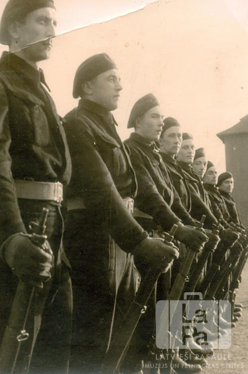 Vīrieši tumšos formastērpos divās rindās stāv "melno vienības" parādē Bikeburgā (Bückeburg). Šajā vienībā dienēja arī cilvēki no Lingenes nometnes (angļu zonā). Vīrieši pie sāna tur šauteni. Skats no apakšas. Otrais no kreisās: Jānis Leitis.