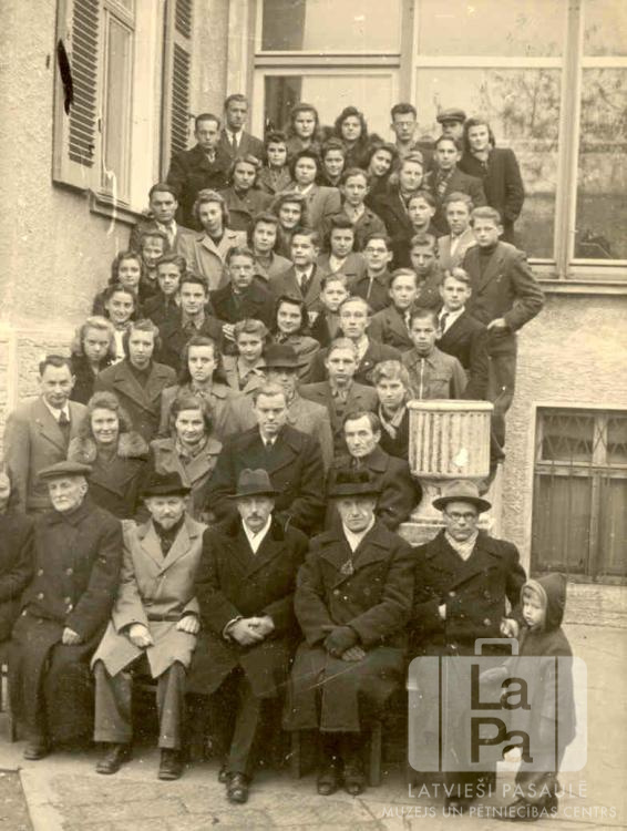 Ģimnāzijas skolotāji un skolēni uz trepēm pie skolas ēkas Lauingenes nometnē (amerikāņu zonā). Visi ir ģērbušies biezos mēteļos, vairākiem vīriešiem galvās ir cepures. Fonā ir ēkas logi. Pirmajā rindā sēž skolotāji, no kreisās: otrais ? Bištēviņš, trešais ? Kaulēns, ceturtais ? Rumpēters un sestais ? Jirgensons. Ceturtajā rindā, ceturtā no kreisās: Valda Ērglis (ar tumšiem matiem; pr. Burvikovs). Grupā vēl ir redzami: Visvaldis Reinholds, Ilga Erniņa, Ingrīda Ramata. Silvija Zvirbule, Edīte Penčuka, Biruta Sproģe, Alīse Ērglis, Ingrīda Klinklava un Dzintars Cukurs.