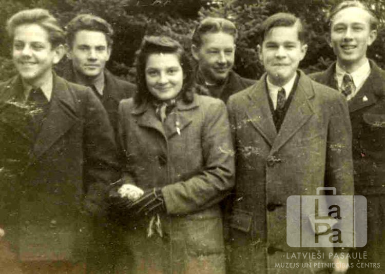 Lauingenes nometnes (amerikāņu zonā) ģimnāzijas 2. klases skolēni. Pieci puiši un viena jauniete, ģērbušies mēteļos, stāv divās rindās. Pirmajā rindā, no kreisās: Dzintars Cukurs, Valda Ērglis (pr. Burvikovs) un Juris Dragūns. Fonā mežs.