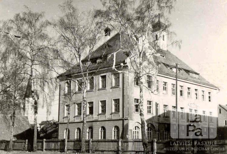 Lauingenes nometnes (amerikāņu zonā) trīsstāvu dzīvojamā ēka. Ēkas priekšā ir augstu bērzu rinda un žogs. Fonā ir redzams baznīcas tornis un citas ēkas.