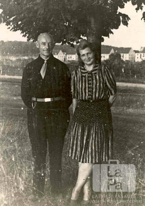 Ērgļu pāris pie Haunštetenes nometnes Augsburgā (amerikāņu zonā) tēva atvaļinājumā laikā no savas "melno vienības" Gisenē. Vīrietis ir ģērbies tumšā formastērpā, sieviete ir ģērbusies svītrainā kleitā. Fonā ir koks lauks un tālumā nometnes ēkas. No kreisās: Žanis Ērglis un Biruta Ērglis.