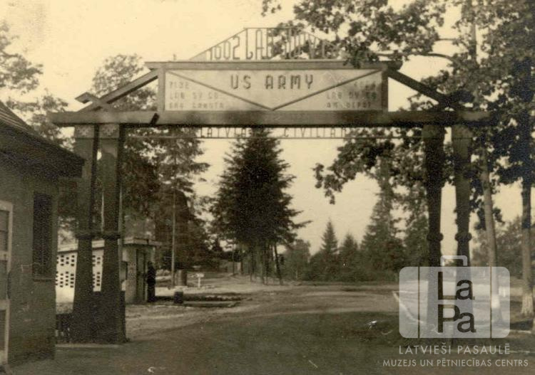 Vārti "melno vienības" transporta rotas nometnē Gisenē (amerikāņu zonā). Vārtiem ir divas kolonnas katrā pusē, tie ir dekorēti ar latviskiem simboliem, tostarp jumi. Vārtu augšpusē ir rakstīts: "US ARMY", zemāk var salasīt "LATVIA CIVILIAN". Kreisajā pusē ir divas ēkas. Aiz vārtiem ir iela un mežs.
