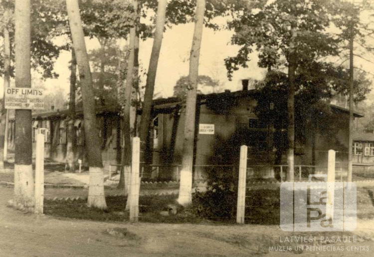 Vienstāvu dzīvojamās barakas "melno vienības" transporta rotas nometnē Gisenē (amerikāņu zonā). Priekšplānā ir koku grupa un metāla sieta žogs ar gaišiem betona stabiem. Kreisajā pusē uz koka ir zīme, uz kuras ir rakstīts "OFF LIMITS" un cits nesalasāms teksts.